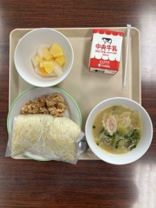 ちゅうかめん とんこつラーメンの汁 とりにくのからあげ 豆乳あんにんポンチ 牛乳