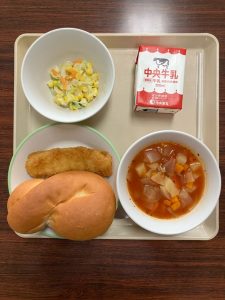 クロスロールパン イカフライのレモンソースがけ コーンサラダ ミネストローネ 牛乳