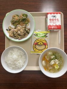 ご飯 スタミナいため かんてんサラダ ワンタンスープ れいとうパイナップル 牛乳