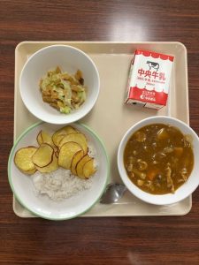 むぎごはん きのこのこめこカレー 福神あえ さつまいもチップス 牛乳