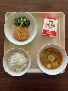 ご飯 さといもコロッケ おひたし お月見汁 牛乳