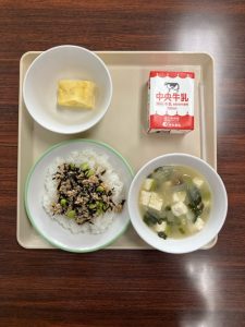 ご飯 ひじき入りそぼろ丼の具 あつやきたまご じゃがいもの白みそ汁 牛乳