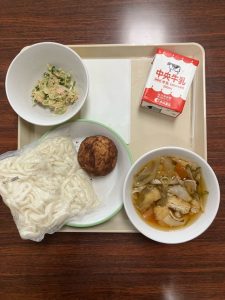 しらたまうどん こぎつねうどんの汁 ツナとみずなのおかかマヨ ミニあげぱん(ココアあじ) 牛乳