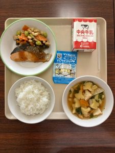 ご飯 さけのおろしだれ だいずのごもく煮 秋のみかく汁 ふりかけ(わかめ)牛乳