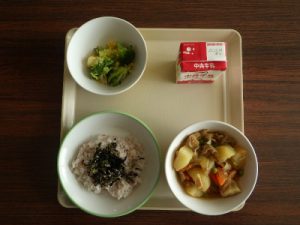 ごこくご飯 肉じゃが ブロッコリーサラダ 手作りひじき入りふりかけ 牛乳