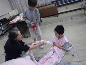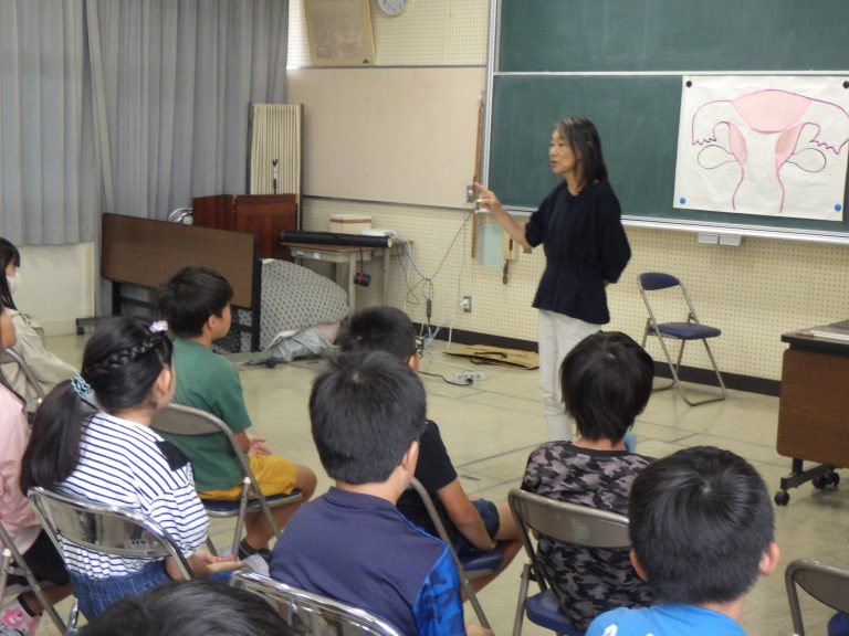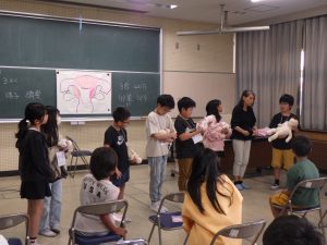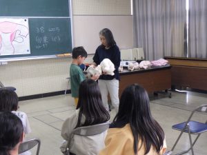 助産師という仕事についてや、赤ちゃんが誕生するまでの過程、おなかの中の赤ちゃんの成長の仕方など、絵や人形等で実際に目や手で触れて、たくさんのことを教えていただきました。