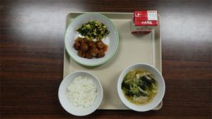 ご飯 中華にくだんご 大豆のもやしナムル わかめスープ 牛乳