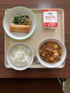 ご飯 マーボーどうふ はるまき 中華サラダ 牛乳