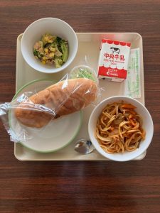 あいちのこめこいりパン トマトスパゲティ ブロッコリーのサラダ セレクトデザート(プリンタルト・あおりんごゼリー) 牛乳