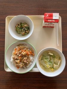 むぎごはん やきにくどんの具 かにかまサラダ わんたんスープ 牛乳