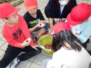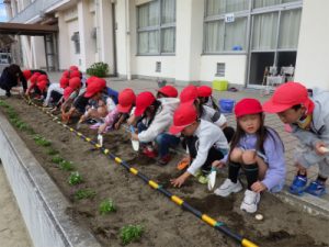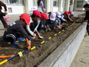 チューリップの球根植え 1年生 2025.11.06 来年の春きれいな花が花壇を彩るようにチューリップの球根を植えました。 茶色の殻を丁寧に取り、目印に沿って色ごとに一列ずつ植えました。 黄・赤・白・桃の花がきれいに咲きますように。