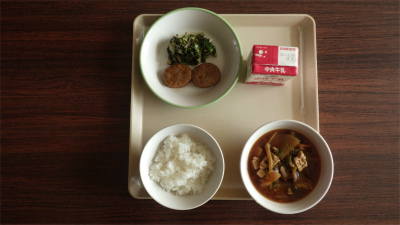ご飯 レバー入り白ごまつくね うめおかかあえ ぶたじる 牛乳