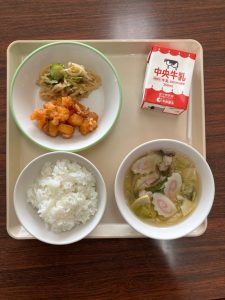 ご飯 しろみ魚のチリソース 切り干し大根のちゅうかサラダ はるさめスープ 牛乳