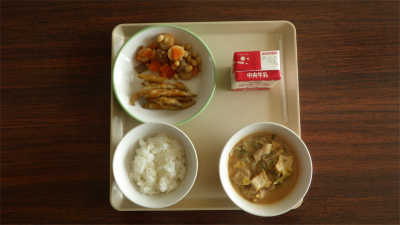 ご飯 わかさぎのあまずあん 大豆のごもくに 冬やさいのとうにゅうじる 牛乳