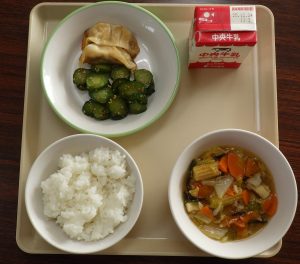 ご飯 はっぽうさい ぎょうざ きゅうりのかおりづけ 牛乳