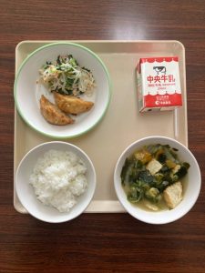 ご飯 あげぎょうざ チンゲンサイのちゅうかサラダ わかめスープ 牛乳