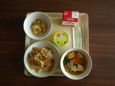 ご飯 キムタクどんの具 わふうポテトサラダ 具だくさんしる ラ・フランスゼリー 牛乳