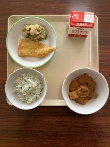 あいちのだいこんはごはん ニギスフライのレモンソース しゅんぎくとツナのあえもの みそおでん 牛乳