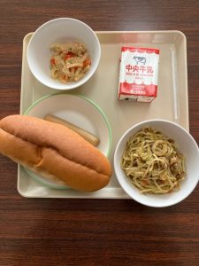 サンドイッチロールパン やきそば フランクフルト だいこんサラダ 牛乳