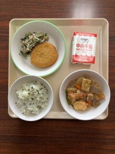 わかめご飯 コロッケ だいこんのうまに あかじそあえ 牛乳