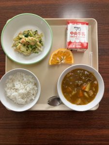 麦ごはん こめこのビーフカレー キャベツとほうれんそうのサラダ いよかん 牛乳