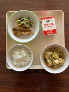 ご飯 めひかりのフライ こしづねぎ入りひきずり こまつなのおひたし 牛乳