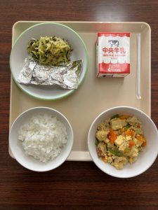ご飯 さんまのぎんがみやき こうやどうふのたまごあえ いそかあえ 牛乳