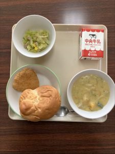 りんごパン こめこホキフライ キャベツソテー かぼちゃのシチュー 牛乳