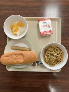 ロールパン やきそば フランクフルト とうにゅうあんにんポンチ 牛乳