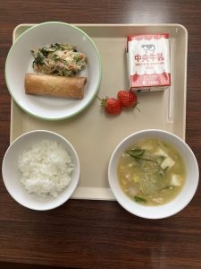 ご飯 あいちの野菜入りはるまき ちゅうかサラダ コーンスープ いちご 牛乳