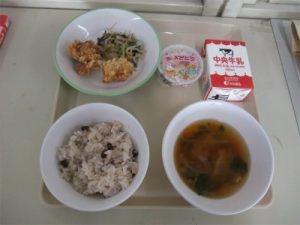 赤飯 鶏肉のから揚げ 土佐和え さくらのすまし汁 お祝いイチゴゼリー 牛乳