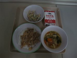 ご飯 豚キムチ マカロニサラダ 具だくさん汁 牛乳