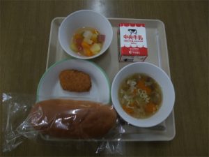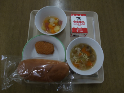 愛知の米粉入りパン コーンフライ アルファベットスープ フルーツポンチ 牛乳